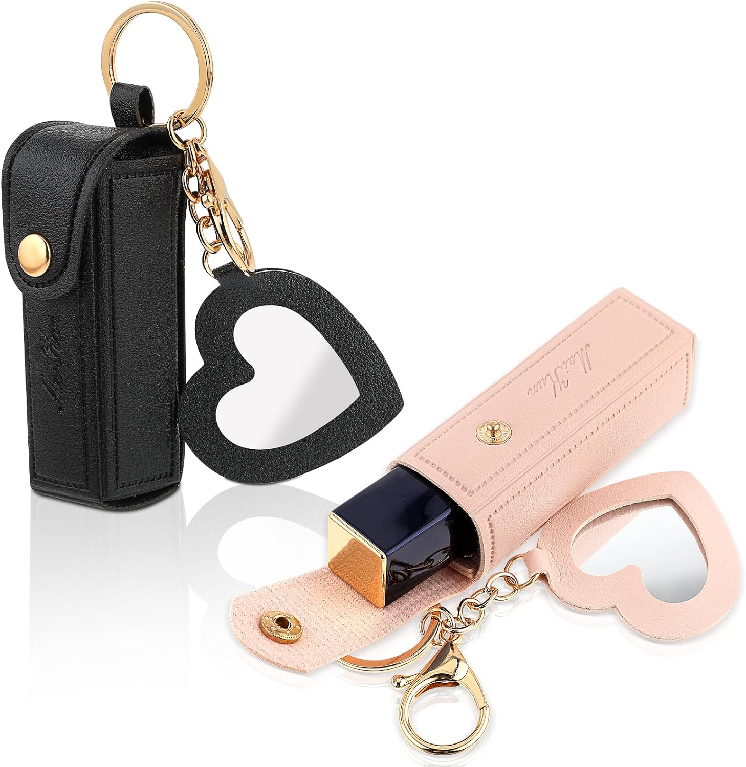 2pcs PU Leather Potable Chapstick Holder Key Chain Bulk with Mirror, Lipstick Pouch, Mini Bag Balm Lip For Women Gift for Travel, Party, Holiday Gifts(Pink and Black)