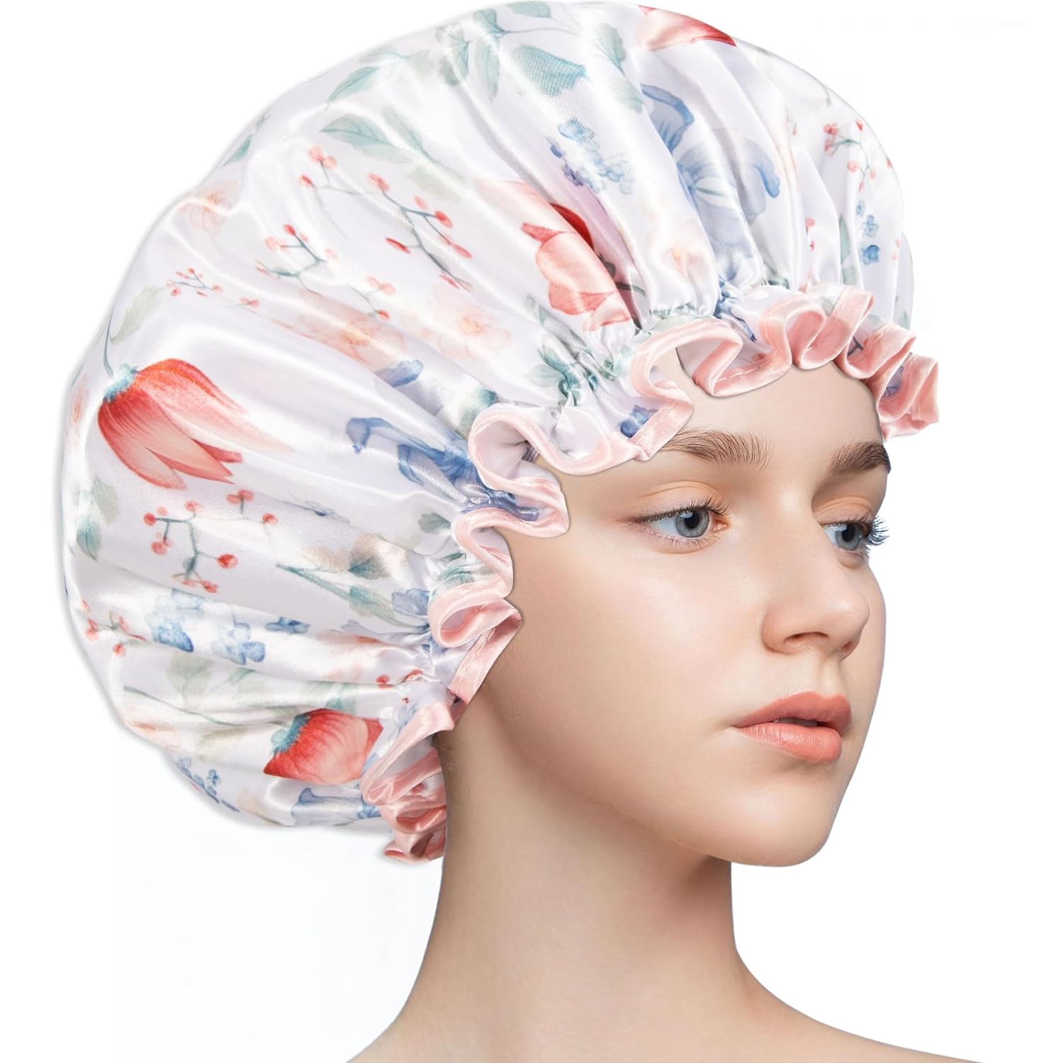 Auban Shower Caps, Waterproof Shower Cap for Women Long Hair, Double Layers Reusable Shower Cap with Soft Comfortable PEVA Lining Non-fading Bathing Shower for Ladies
