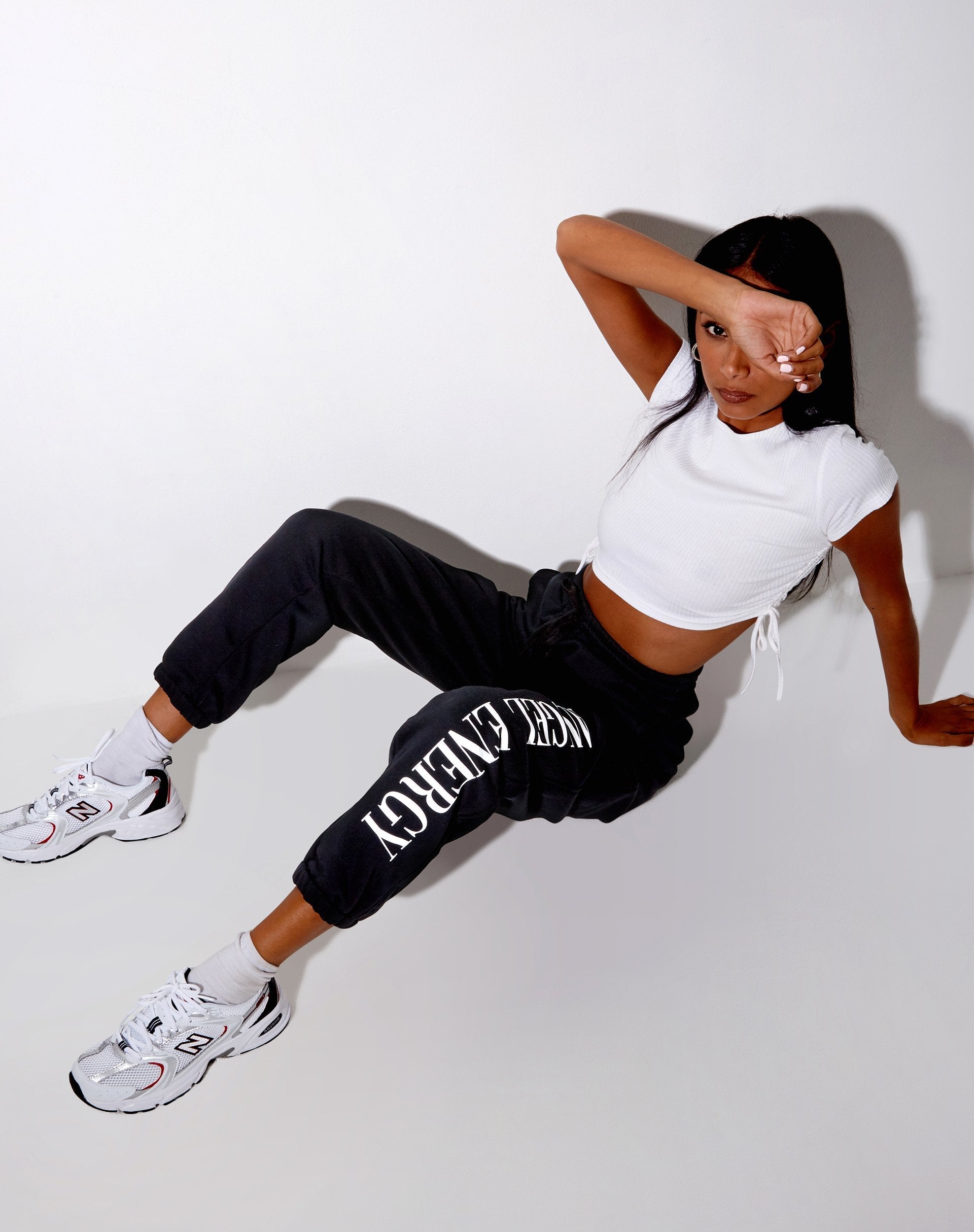 Living for tracksuit bottoms? These comfy Basta joggers come in black and feature an angel energy print, elasticated high waist with drawstrings, and a loose fit with cuffed bottoms. Style with chunky trainers, a Tiner crop top, and layer the look up with our matching Glo.