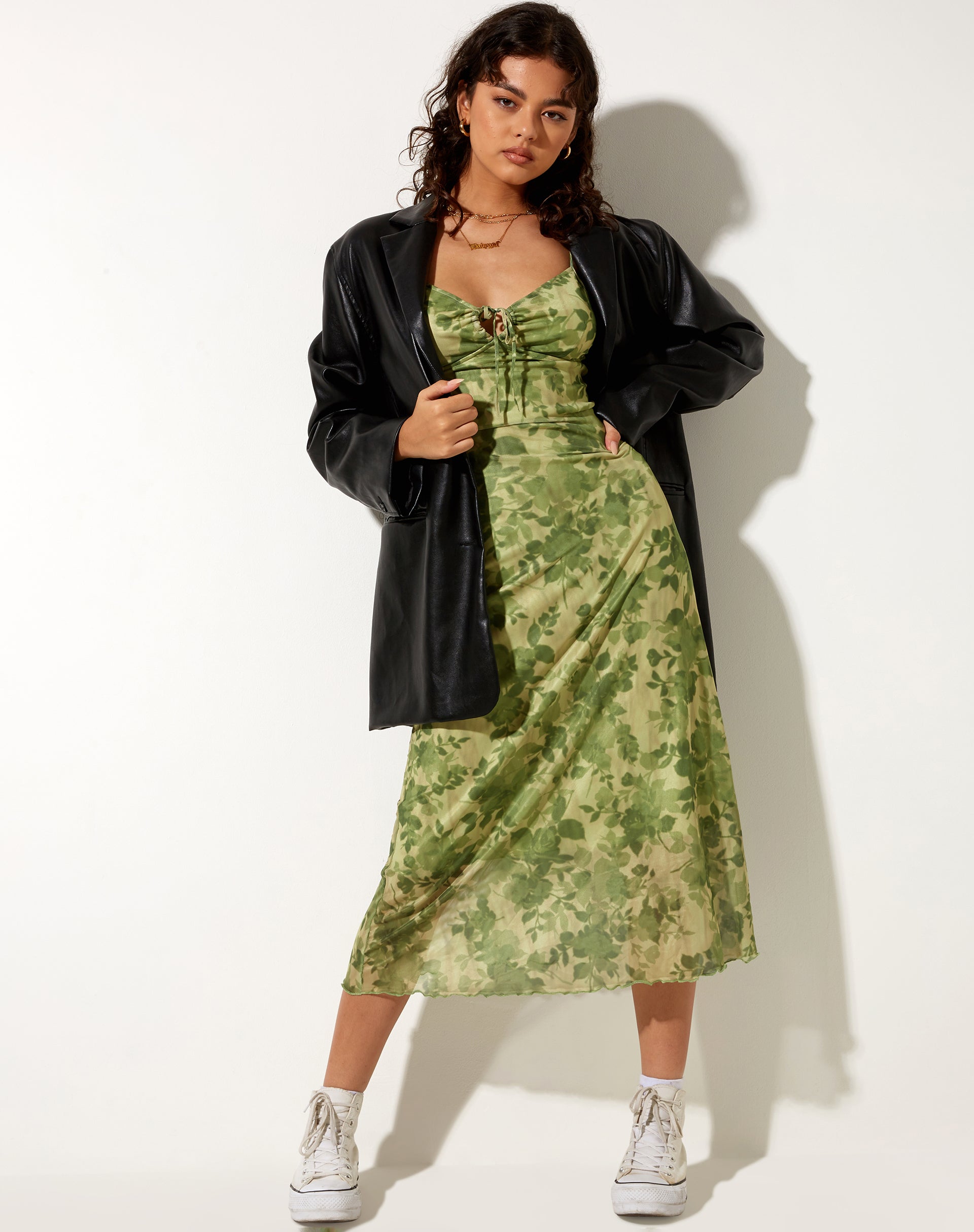 The Coya dress has got us dreaming of summer days. Featuring a midi fit with thin straps and tie up detailing in a green blurred floral print. Throw over a leather jacket and add trainers to keep it casual.