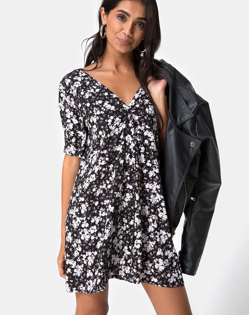 There's still room for a dress in your wardrobe, so why invest in the Crosena dress and be covered everyday. In a dark wild flower, it features a loose swing fit with v neckline, button down front and cut tie detail to the back. Add a cute boot and biker jacket, and you're good to go.