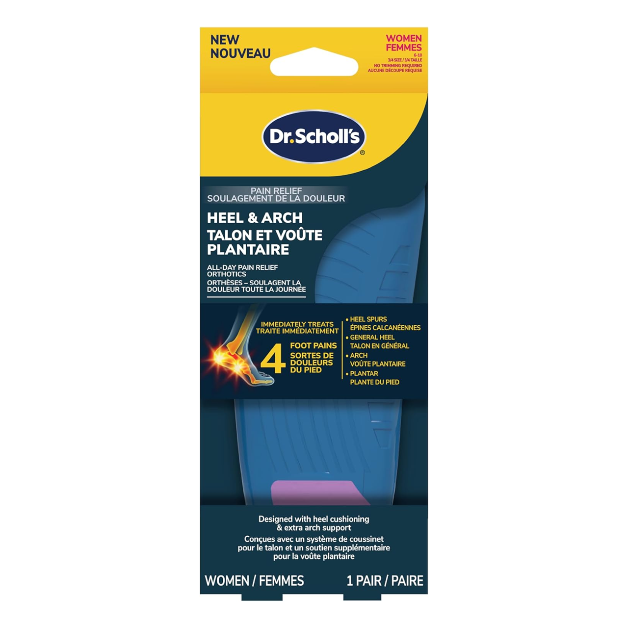 Dr. Scholl Pain Relief Orthotics for Heel Pain specifically for women who suffer from heel pain, including pain from plantar fasciitis and heel spurs. They have Shock Guard Technology to treat pain at the source, so you can feel immediate and all-day relief. The package contains one pair of insoles to fit women's shoe sizes 6-10.