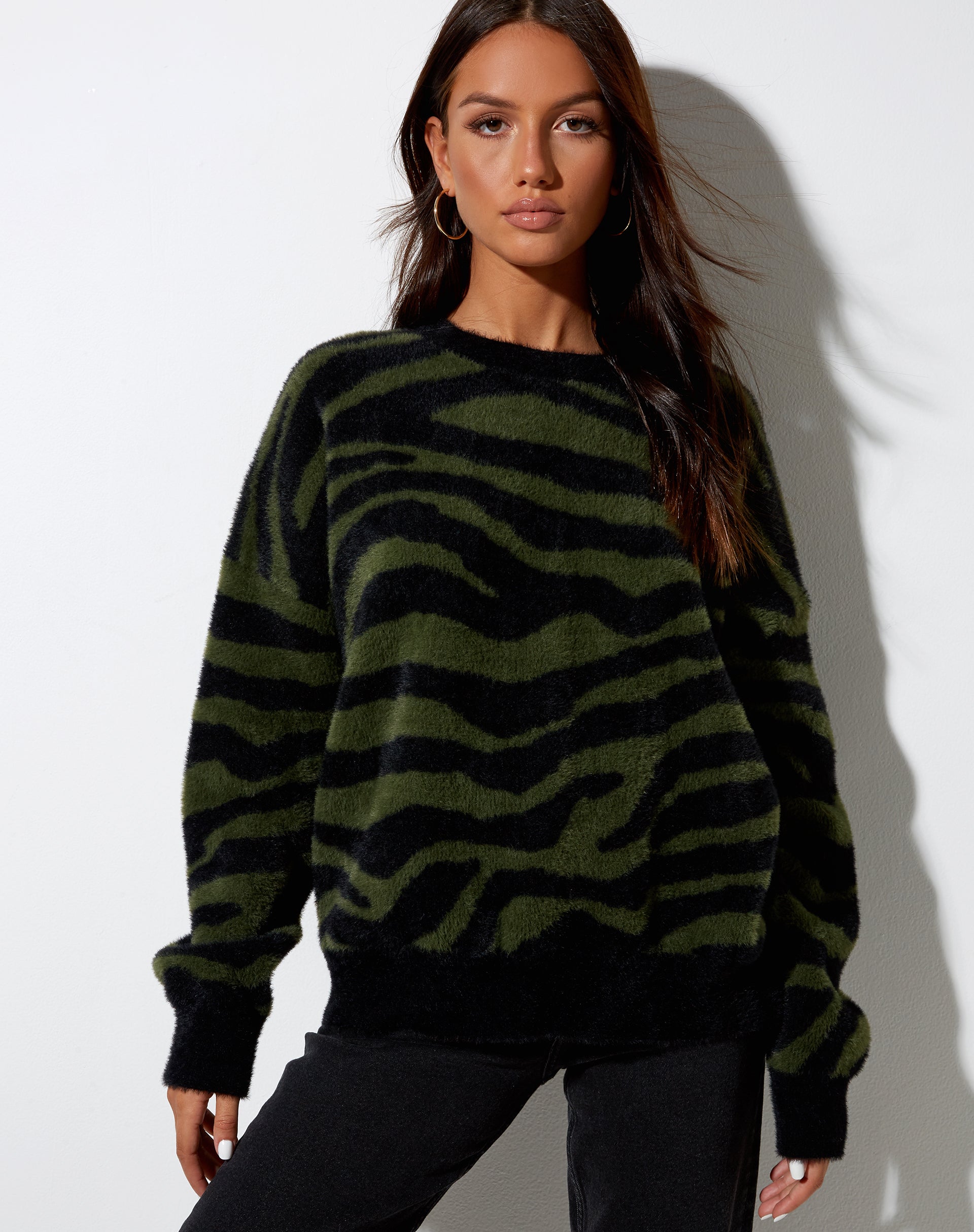 Keep cosy and comfy in our Eleni Jumper. In an olive green and black knitted zebra print, it features a loose oversize fit with long sleeves, crew neckline and black trim. For those casual days simply pair with our carpenter jeans in black.