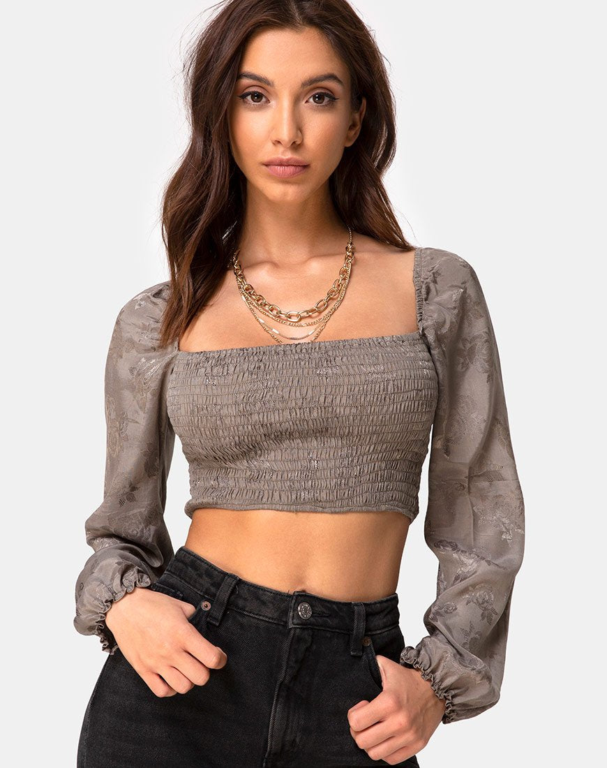 Romance on em'! Satin Rose Silver Grey floral print long sleeve top, elasticated bust with square neck and long puffed sleeves. Perfect winter wardrobe addition! Pair with Mom Jeans in Black Wash by Motel and clear mule sandals!