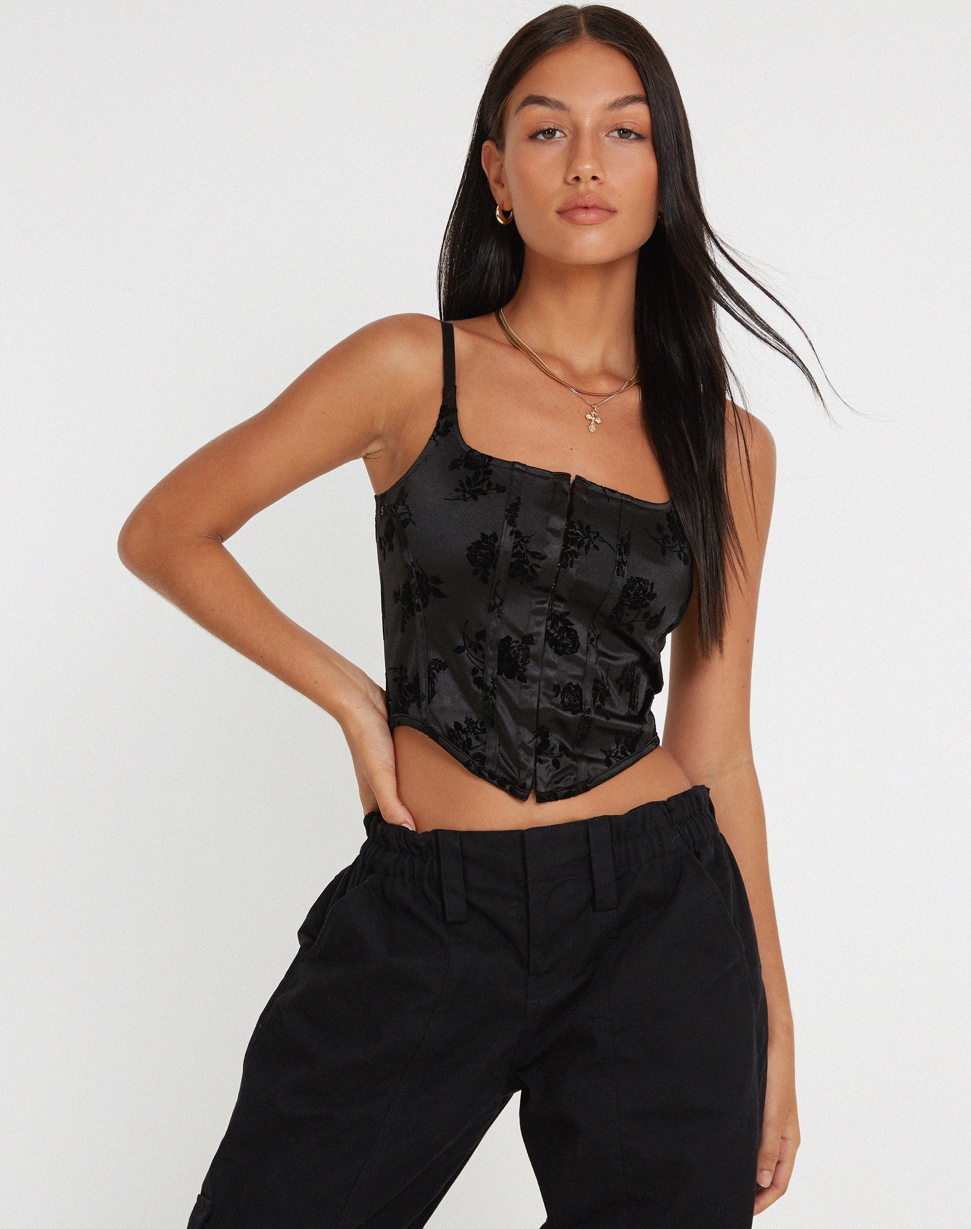 Dress up any look with our Ello top. In in black rose flock, it features a square neckline with hook and eye fastening. We love to style with ours with the Hansa trousers in black.