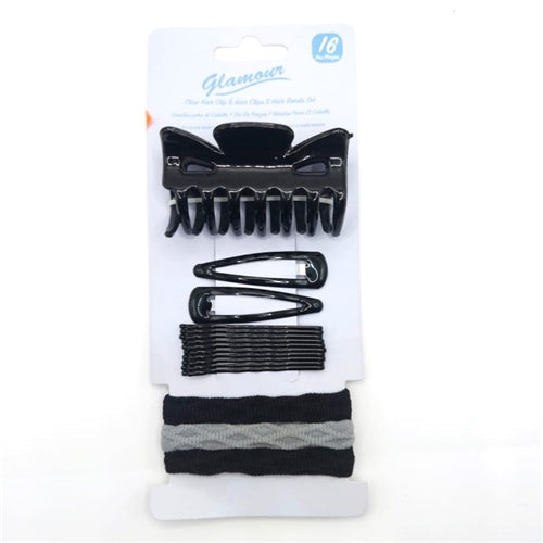 Glamour Hair Clips & Hair Bands Set, 16's Black & Grey