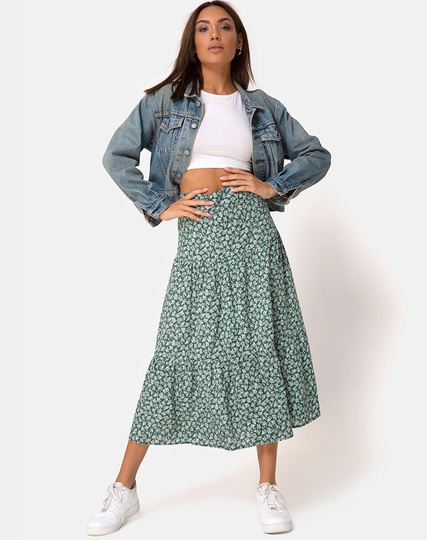 The perfect skirt for any occasion, cold, warm, winter or summer. We've got you covered with our Gleas skirt. Featuring a maxi length, high waist and green floral print. Wear with white trainers and denim jacket for a casual look.