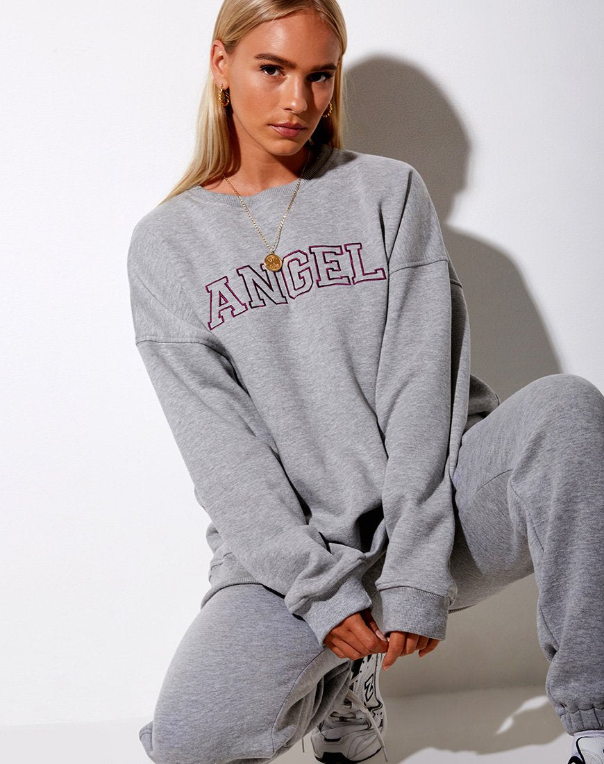 Our Glo sweatshirt is perfect for those cooler days. With a grey oversize fit, crew neckline and long sleeves, it features a burgundy 'Angel' embro to the front. Easily paired with denim for a super casual fit.