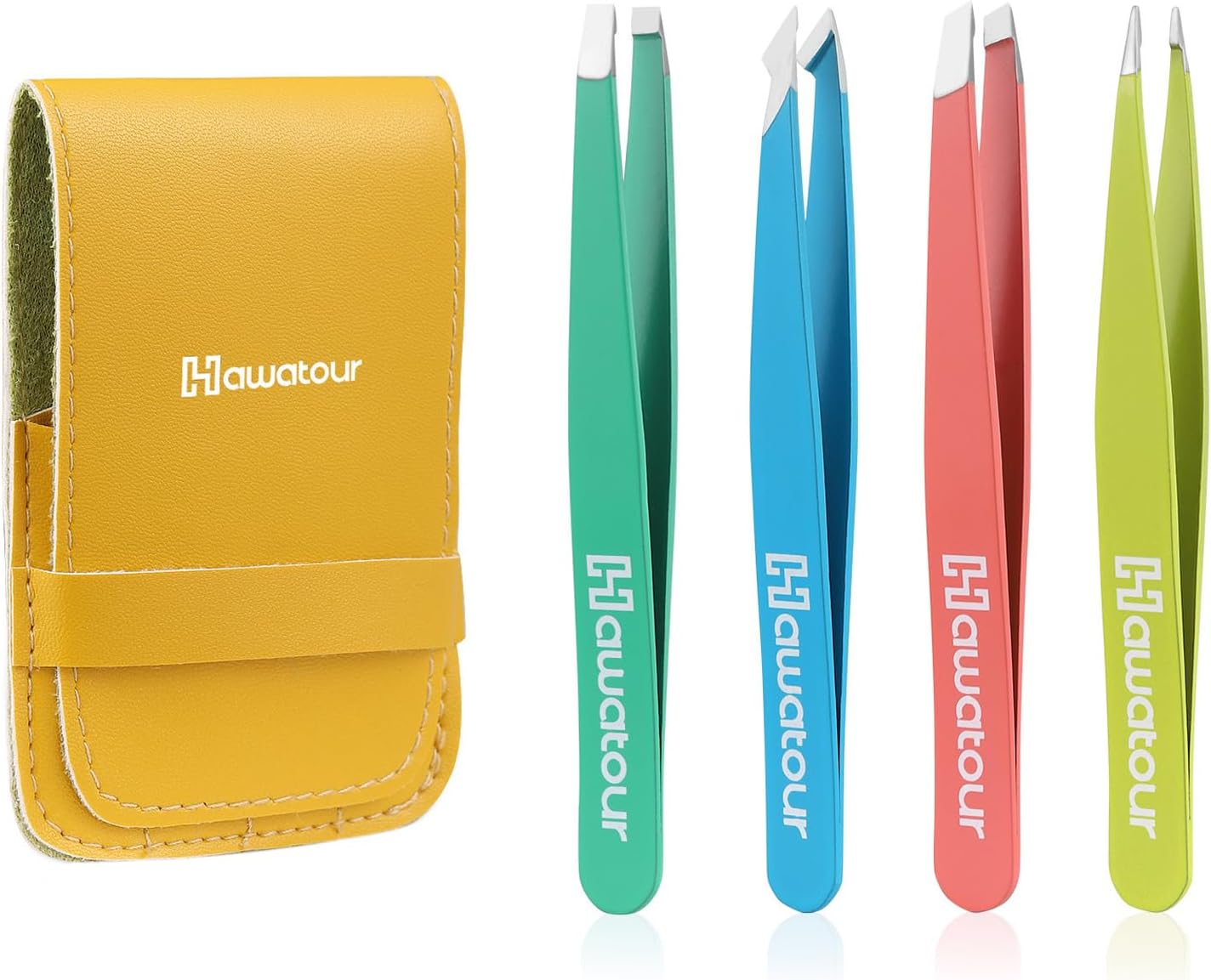 HAWATOUR Tweezers Set, 4Pcs Eyebrows Tweezers with Leather Case for Women and Men, Great Precision for Eyebrow, Ingrown Hair, Splinter, Facial Hair Removal, Multicolored
