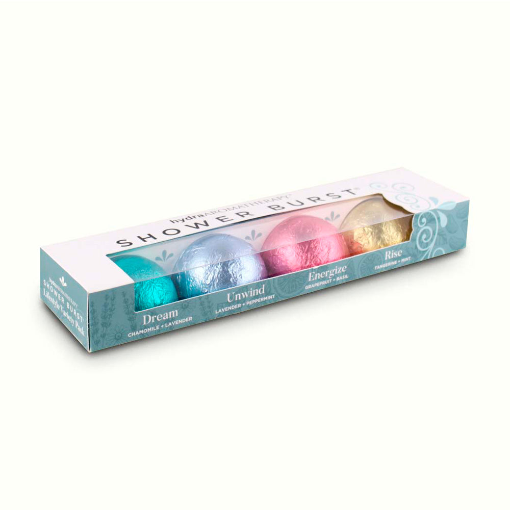 Transform an ordinary shower into an aromatherapy experience with the multiuse HydraAromatherapy Shower Burst Lifestyle Collection. Just unwrap and place a Shower Burst in the shower and let indirect spray activate the aroma. Wrapped in colorful foil, this eye-catching retail variety pack is an easy sell for customers looking for a unique way to enjoy aromatherapy daily. Collection includes 1 each of the following 2 oz. Shower Bursts: Rise, Energize, Unwind, and Dream. Made with pure essential oils. Includes 1 sachet to hang Shower Burst. 10.25" L x 2.5" D x 1.38" H
