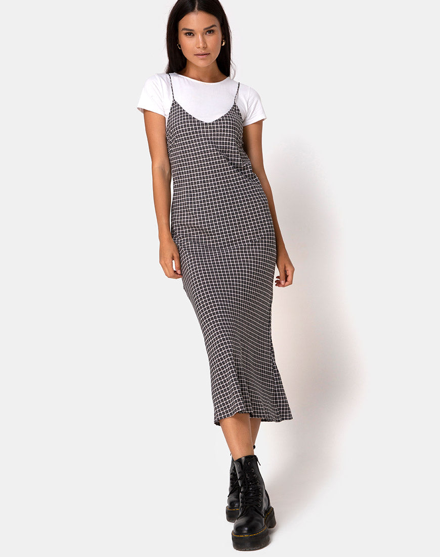 Looking for a new staple for your wardrobe? The Juvina Dress is what you need. in Check It Out Black, thin straps v neckline, midi dress. Keep it casual with a tee or dress it up with a waist belt and some heels.