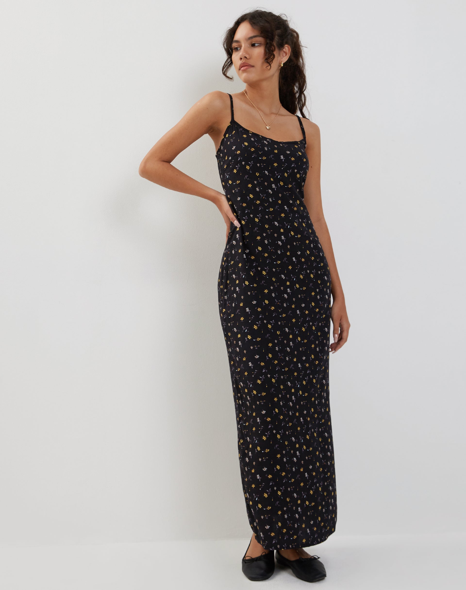 Spring is here with our Kafka Dress. Featuring a maxi fit, a scoop neckline and a split at the back with a black floral print.