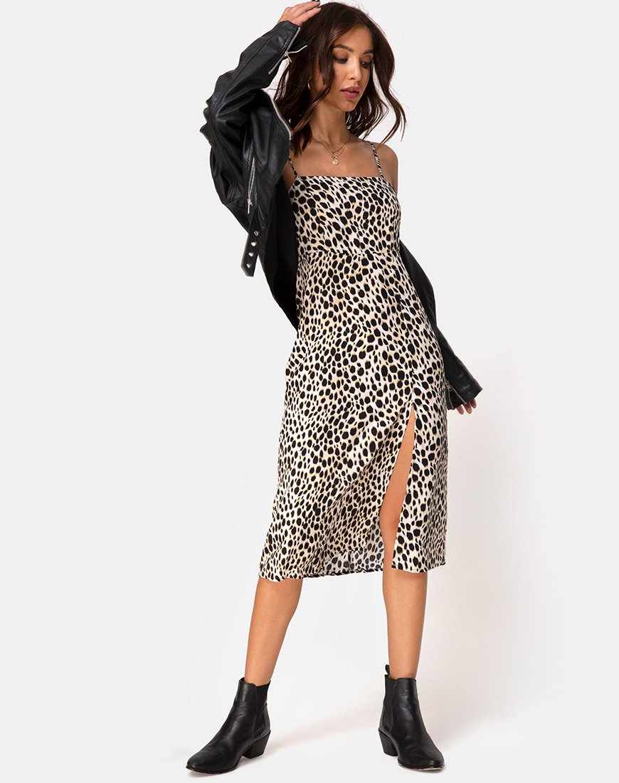 Make a roaring entrance in our Kaoya midi dress at your fave music fest! Featuring a square neckline, thin straps, a relaxed fit, and cheeky thigh-high, side split with dark brown and cream coloured cheetah print, this dress deserves a place in your wardrobe! Team this with ankle boots for an effortlessly chic effect.