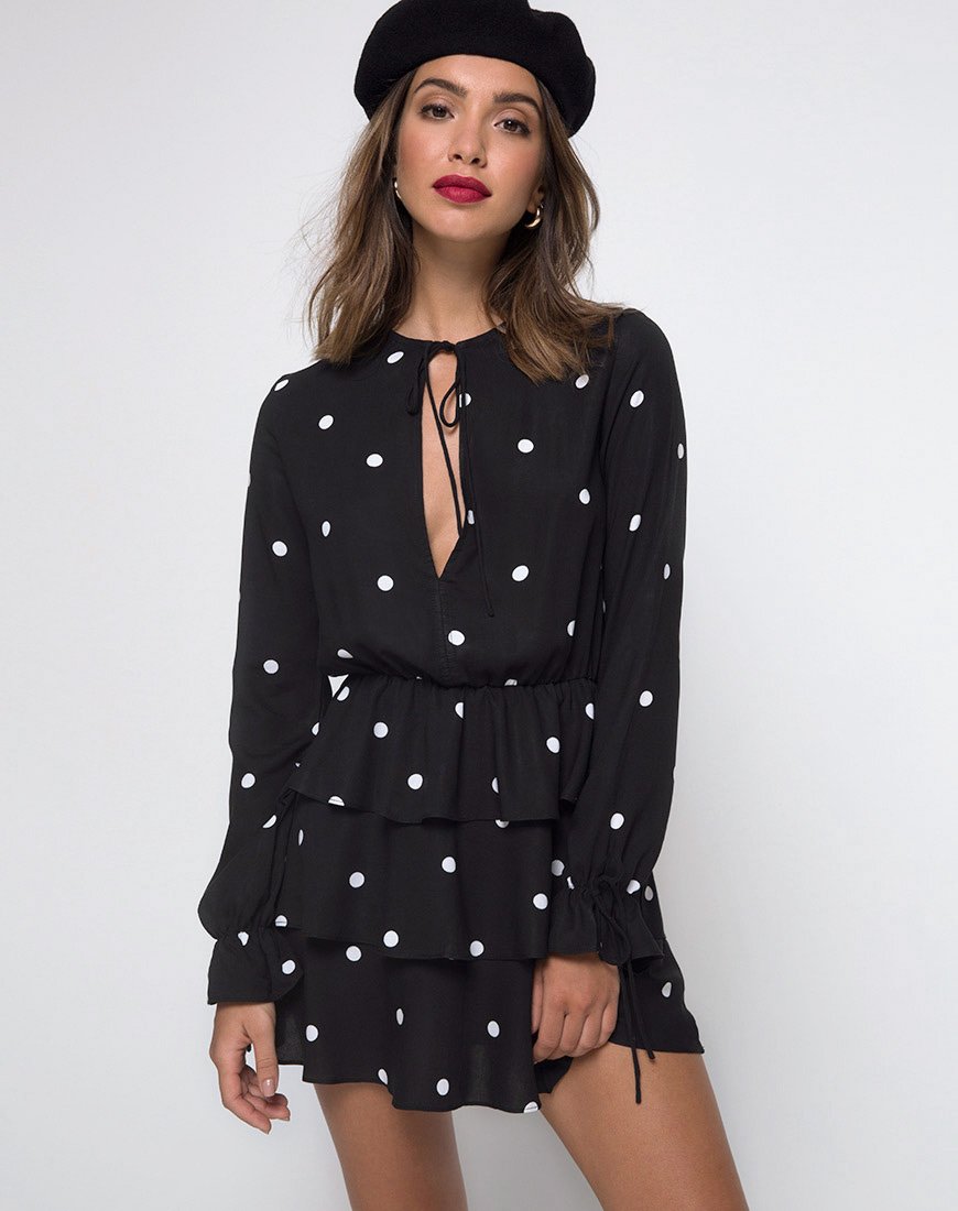 Prints are everywhere rn, so why not opt for the trending polkadot. The Kepsibelle dress is fun and flirty in the black and white print featuring an opal cutout, long sleeves and skater waistling with peplum hem. For evening drinks it look super chic with a beret and colour pop shoes.