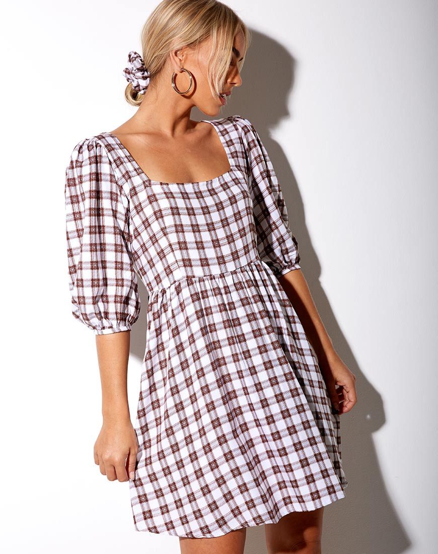 Our Kezie dress needs checking in to your wardrobe! Featuring a loose skater fit, square neckline, and 3/4 sleeves, in a brown and white check print. Keep it stylish and add white cowboy boots!