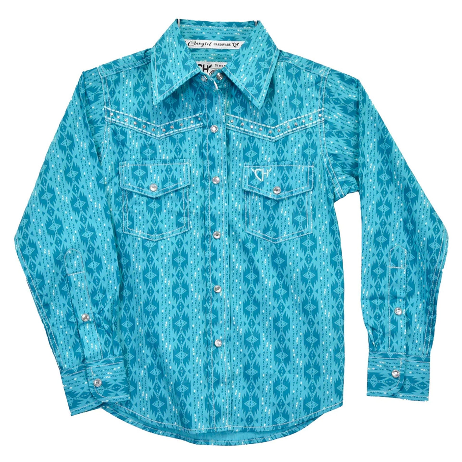 This kid's Western Shirt features a bold Turquoise Aztec pattern on a traditional snap front shirt with white stitching to define the yoke.