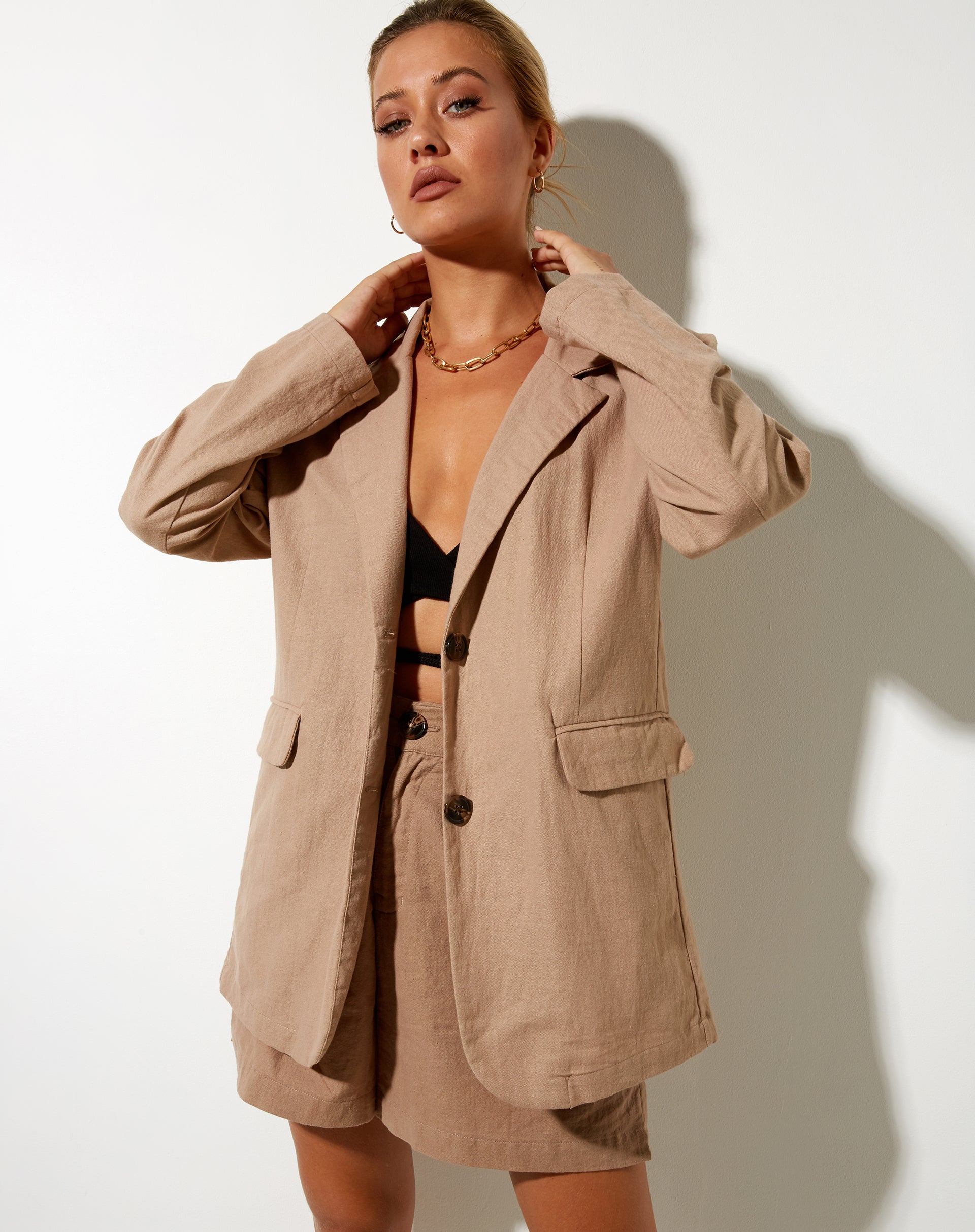 Our Maiwa blazer is perfect for a cocktail night. In Rami Biscuit, it features a collared neckline, button detailing and pockets. Style open with a white crop and our matching Lex shorts.
