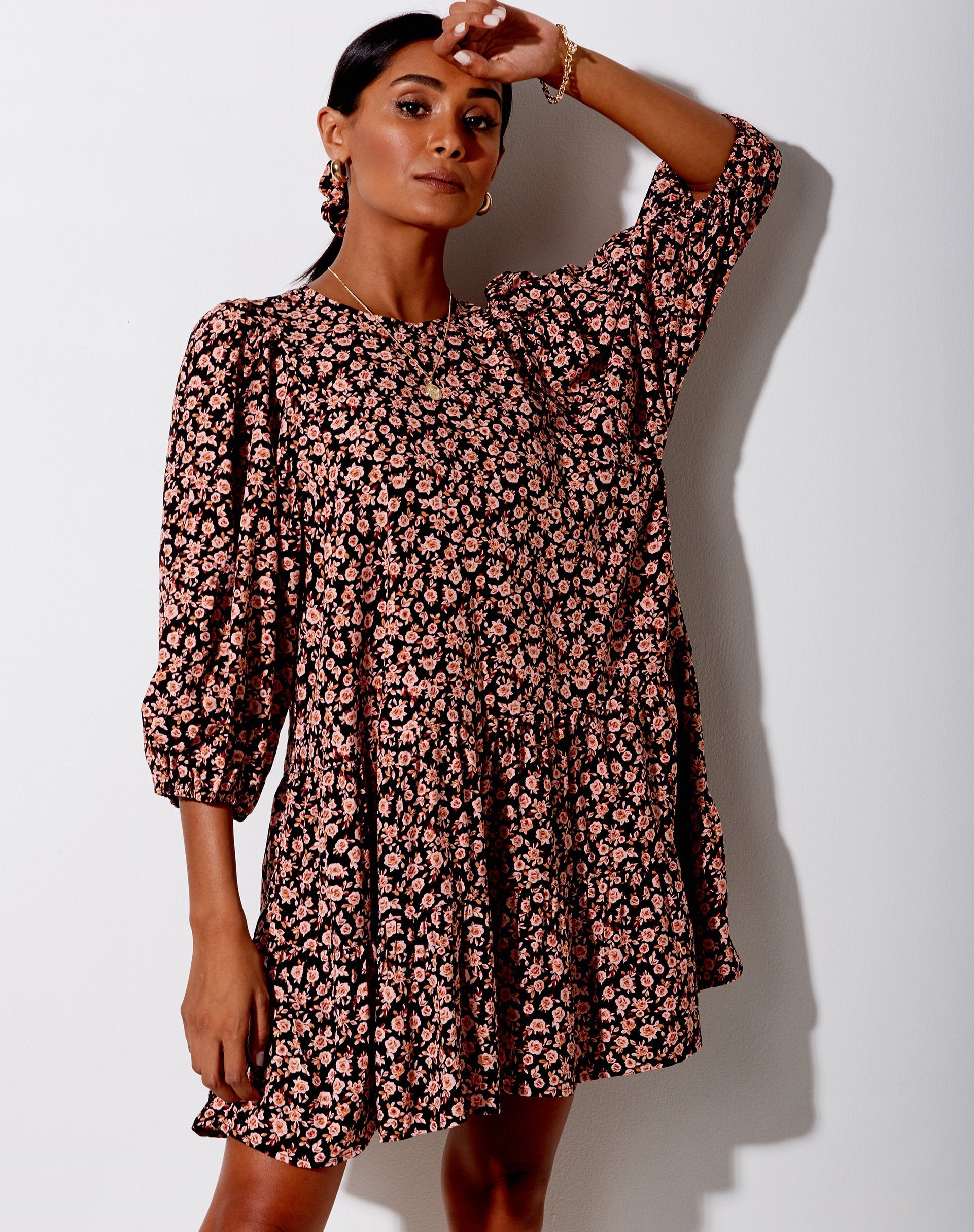 Look boho-chic with minimal effort in our Mareta dress. In an Autumn Blossom floral print, it features a crew neckline, 3/4 length sleeves, and a loose swing mini fit with a frill hem. Style with some white socks, boots, and simple hoops and you're good to go!