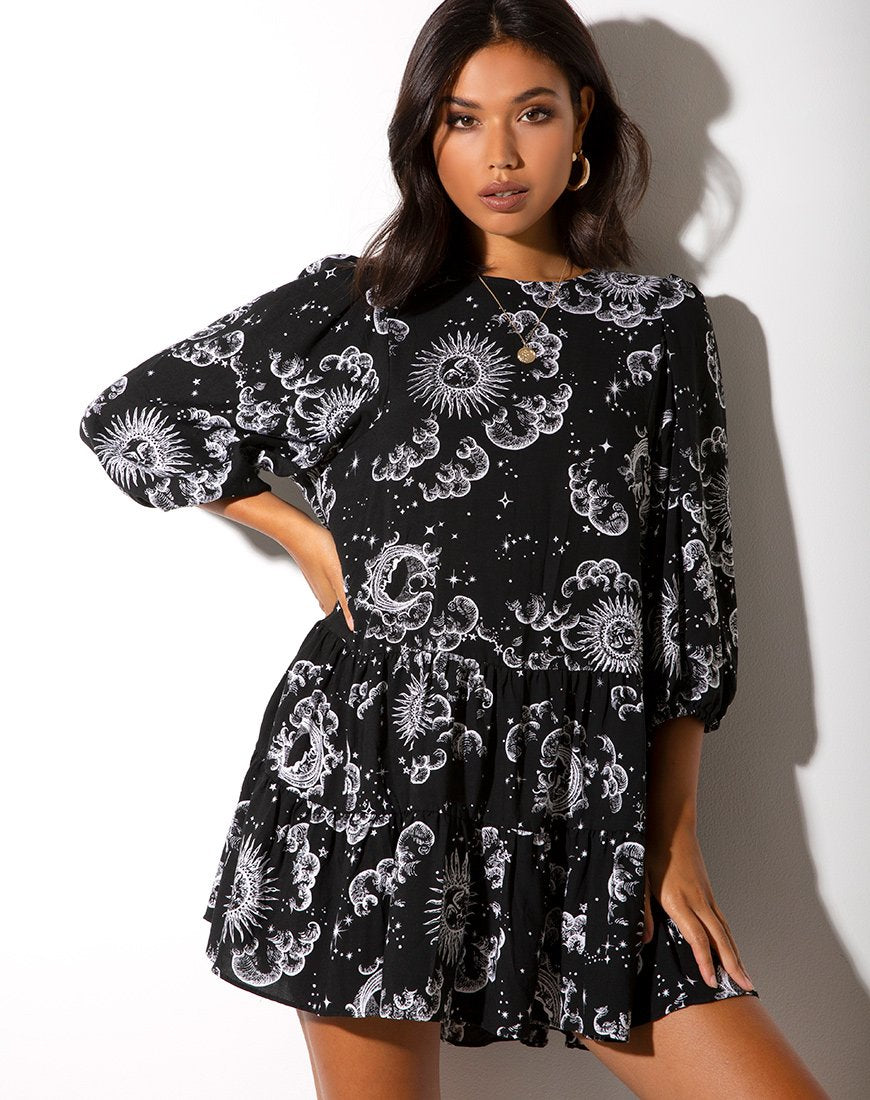 For those casual days, the Mareta dress has got you covered. In a loose swing fit it features a crew neckline, 3/4 sleeves with a frill hem, in a black and white sky print. Keep it simple with a chelsea boot and shoulder bag.
