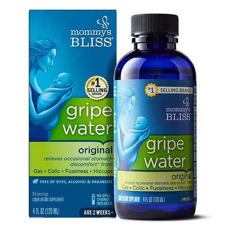 Mommy's Bliss Gripe Water Original is a safe and effective herbal supplement used to safely & naturally relieve stomach discomfort & gas occasionally associated with colic, upset tummy, hiccups, teething and general fussiness in babies 2 weeks and older.