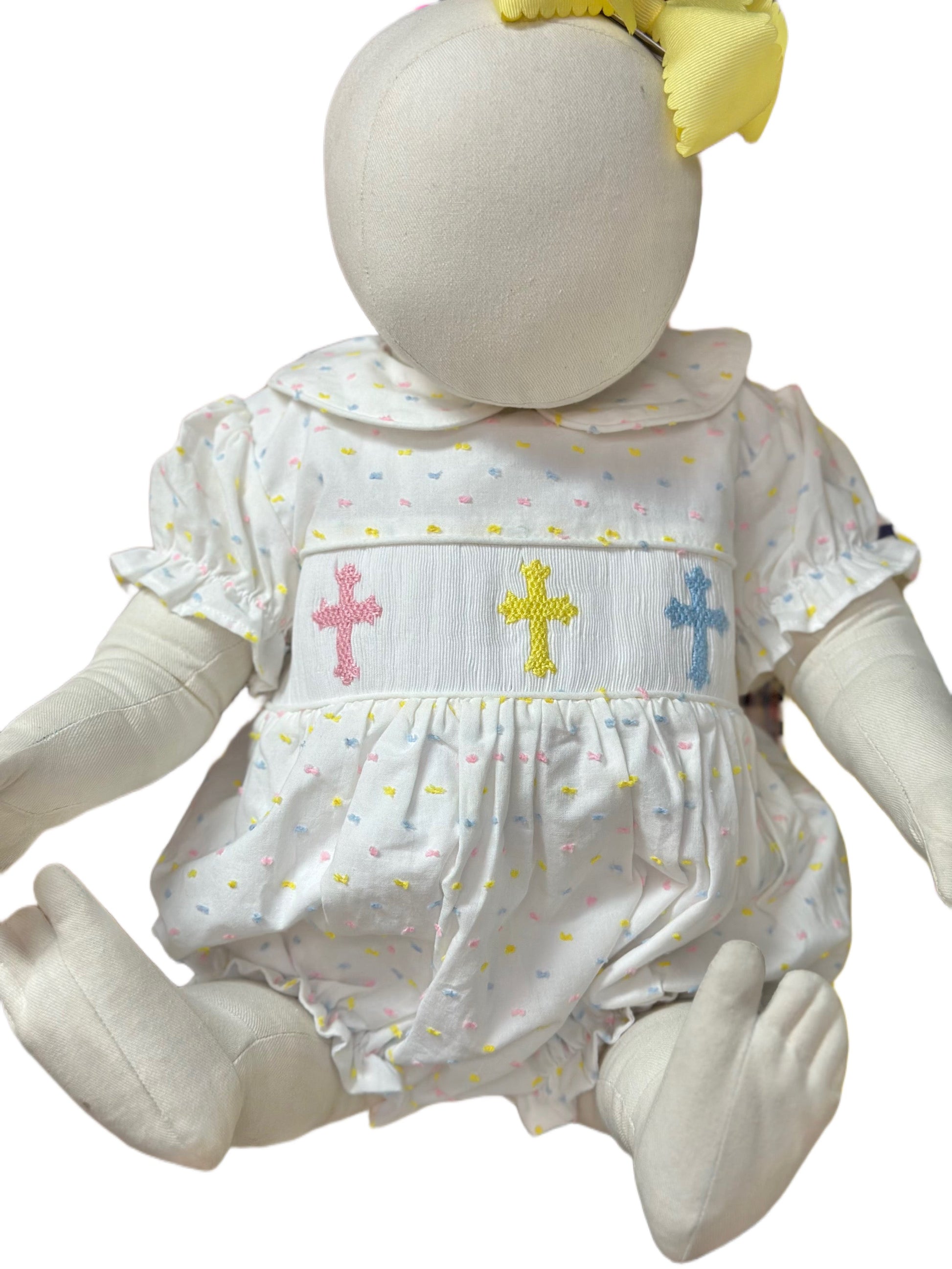 Get ready to fall in love with our Multi Colored Smock Cross Girl Bubble! This adorable white bubble features delightful multicolored swiss dots that add a fun flair. The pink, yellow, and light blue smocked crosses not only make it a standout piece, but also add a touch of sweetness. Perfect for any occasion, your little one will look absolutely charming in this bubbly outfit!