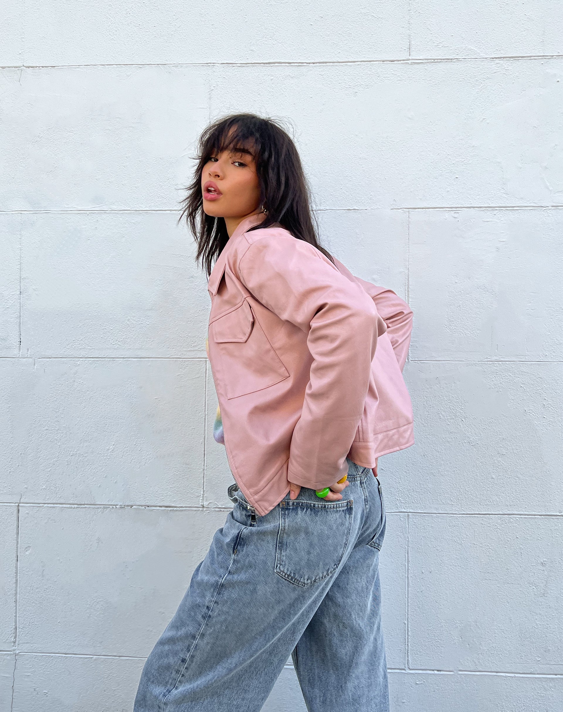 Level up your look this season with the Natara jacket. Featuring long sleeves with zip up fastening, collar and pocket detailing in a PU soft pink. Style with our Ammaria jumper, low rise Parallel jeans and some chunky trainers.