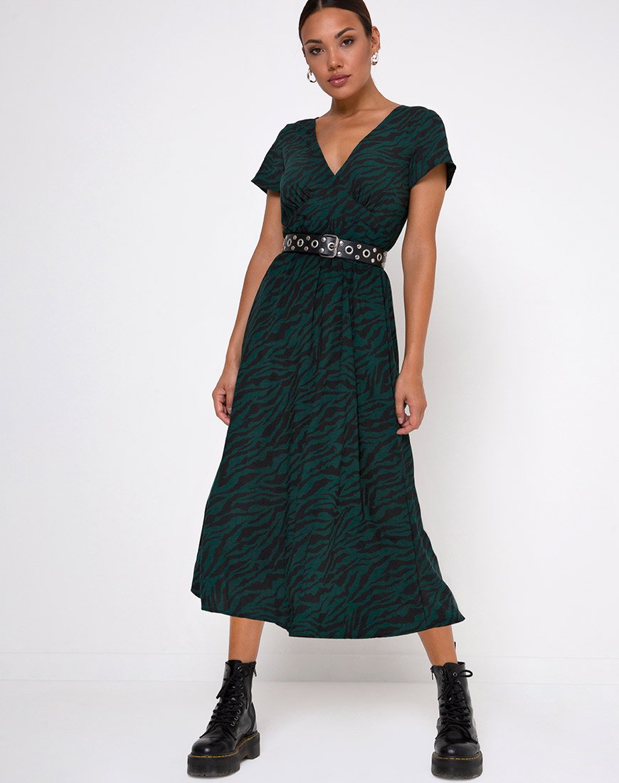 Nira Midi Dress in 90's Zebra Forest Green