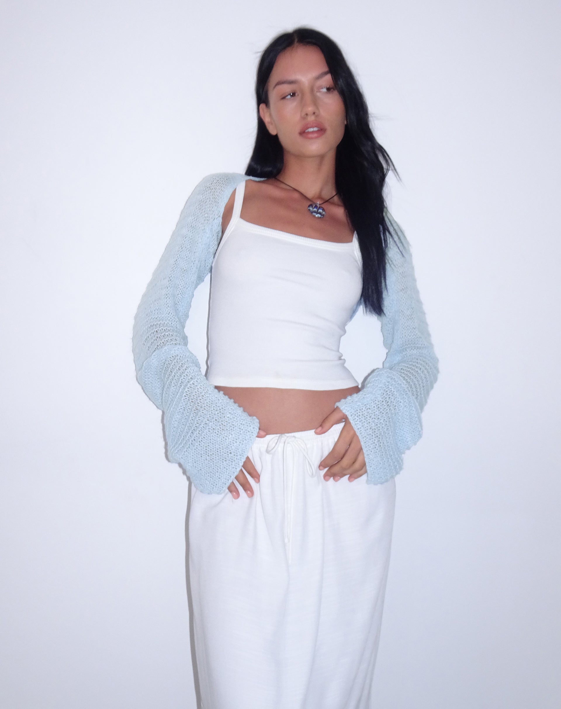 Introducing the Nobila shrug - a wardrobe staple. Featuring a cropped fit with long sleeves in a baby blue knit fabric.