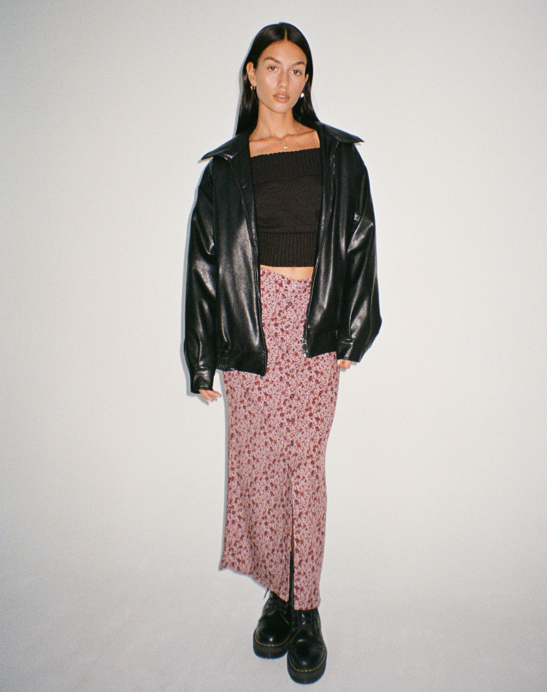 Our Relow skirt is the perfect pick. In 90's floral burgundy, it features a maxi, a-line fit with button detailing and a front slit. Finish the look with our Koriya top.