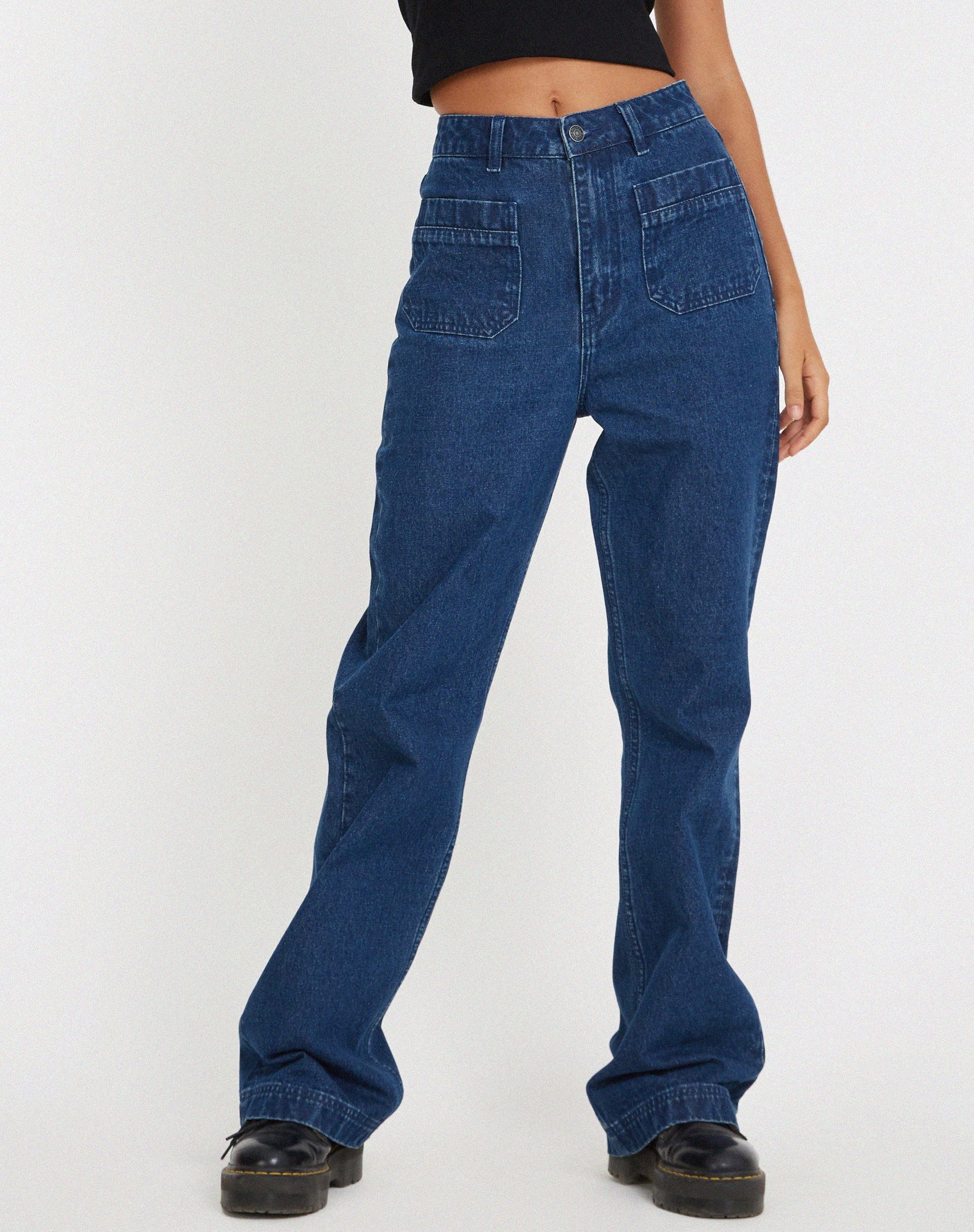 There's always a place for denim so ensure to keep yours updated with the retro pocket flare jean. In a deep indigo they feature a high waist, flare leg, pocket detailing to the front with belt loop with button and fly zip fastening. Pair with our Surtie top in black.