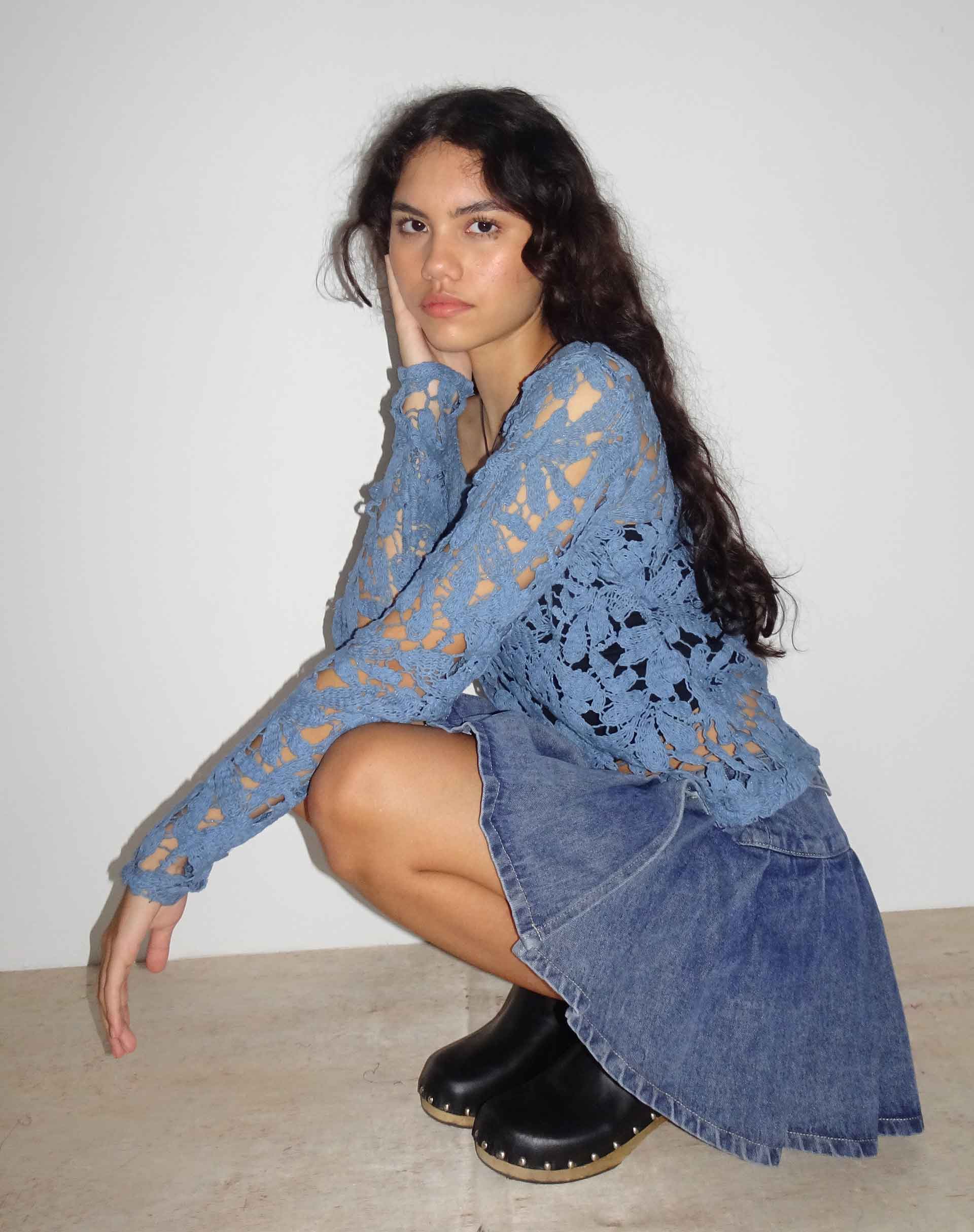 Get festival ready with our Ripu top. Featuring an open floral crochet knit with long sleeves and a round neck, we love to style with our Castari Mini.