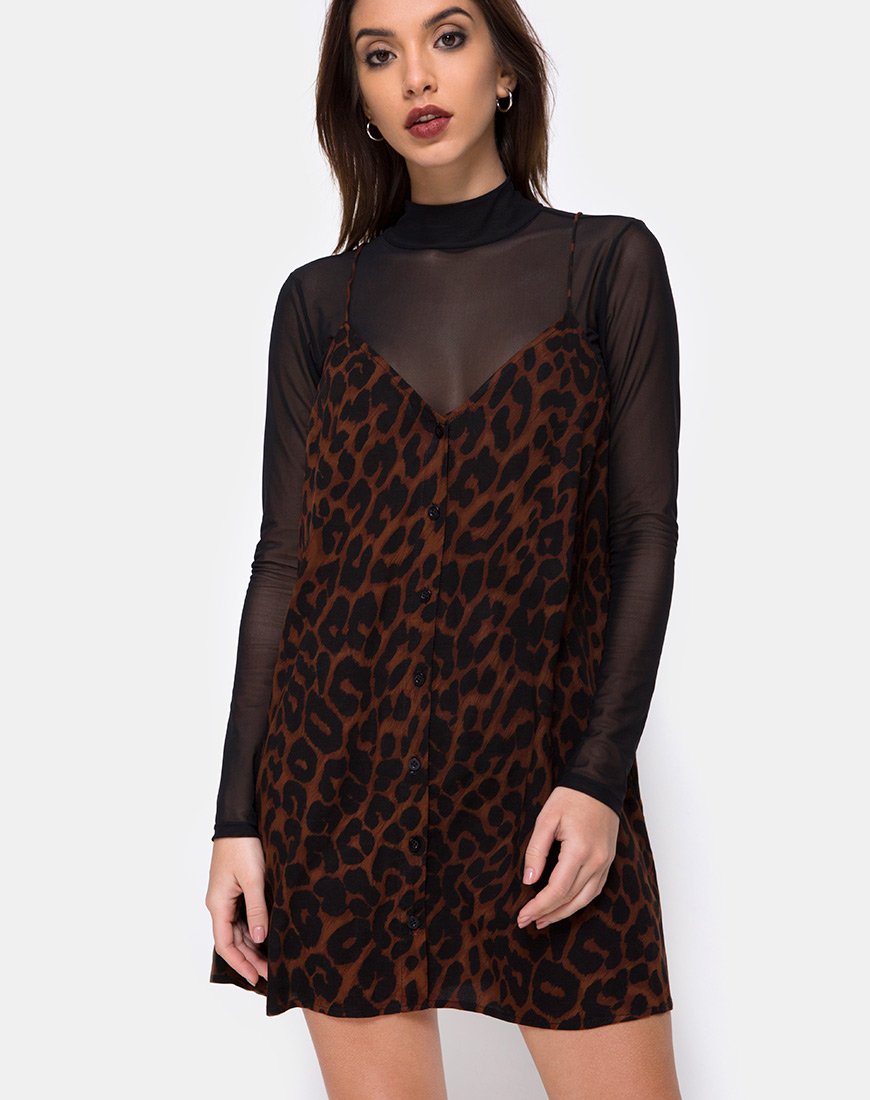 Wild and sassy or chic and casual, the Sanna dress is a number one must have! In a loose mini fit it features a v neckline with thin straps and a black and brown oversize jaguar print. Layered over a mesh bodice will you wear with heels or chunky trainer?