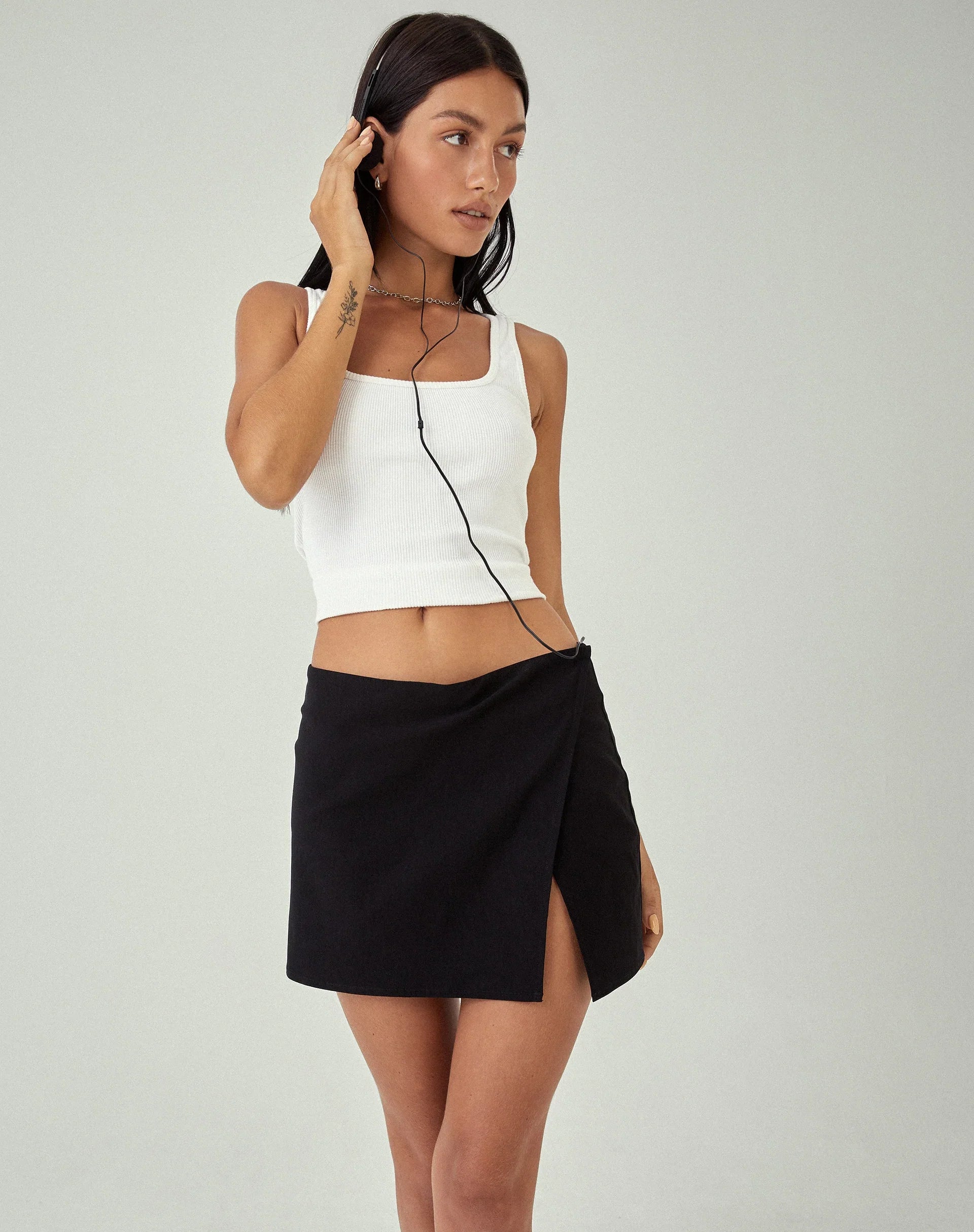 The Sarko skirt is simple but stylish. In black, it features a mini, a-line fit with a side split. Perfect when paired with our Roxe top.