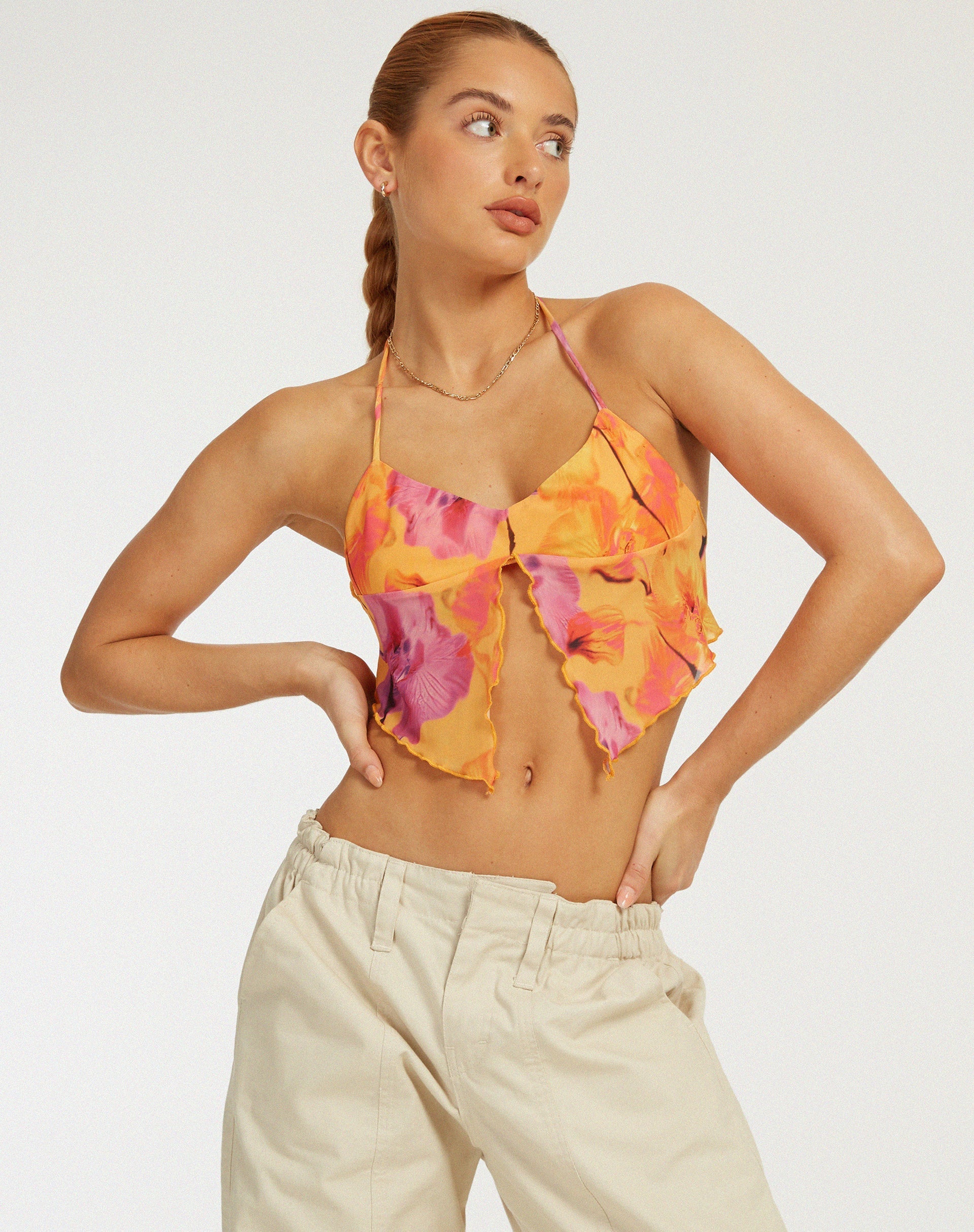 Amp up your top collection with the Shaman. In a pink and orange floral print, it features a sleeveless fit, scoop neckline, split front with lettuce hem detailing and halterneck straps. Be Summer ready and style with the Hansa trousers.