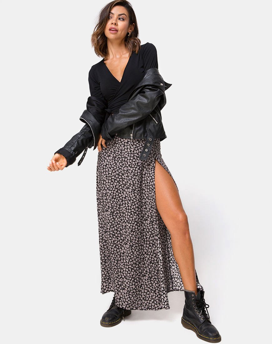 Florals can be for the grunge girl too with the ditsy rose black. The not so sweet shayk skirt features a high waisted maxi length fit with super sassy side split. Go from day to night with a basic crop top and statement jewellery.