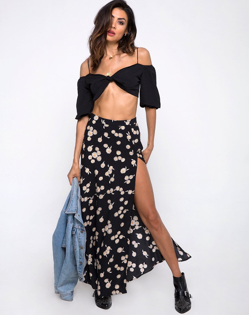 Bold and playful, florals have stolen the spotlight. Think they're too girlie? Think again with the Shayk skirt, in our grunge daisy floral it features a high waisted floor length fit with super sassy side split. Go ultra chic with Cavazza crop, western style boot and cute fringed bag.