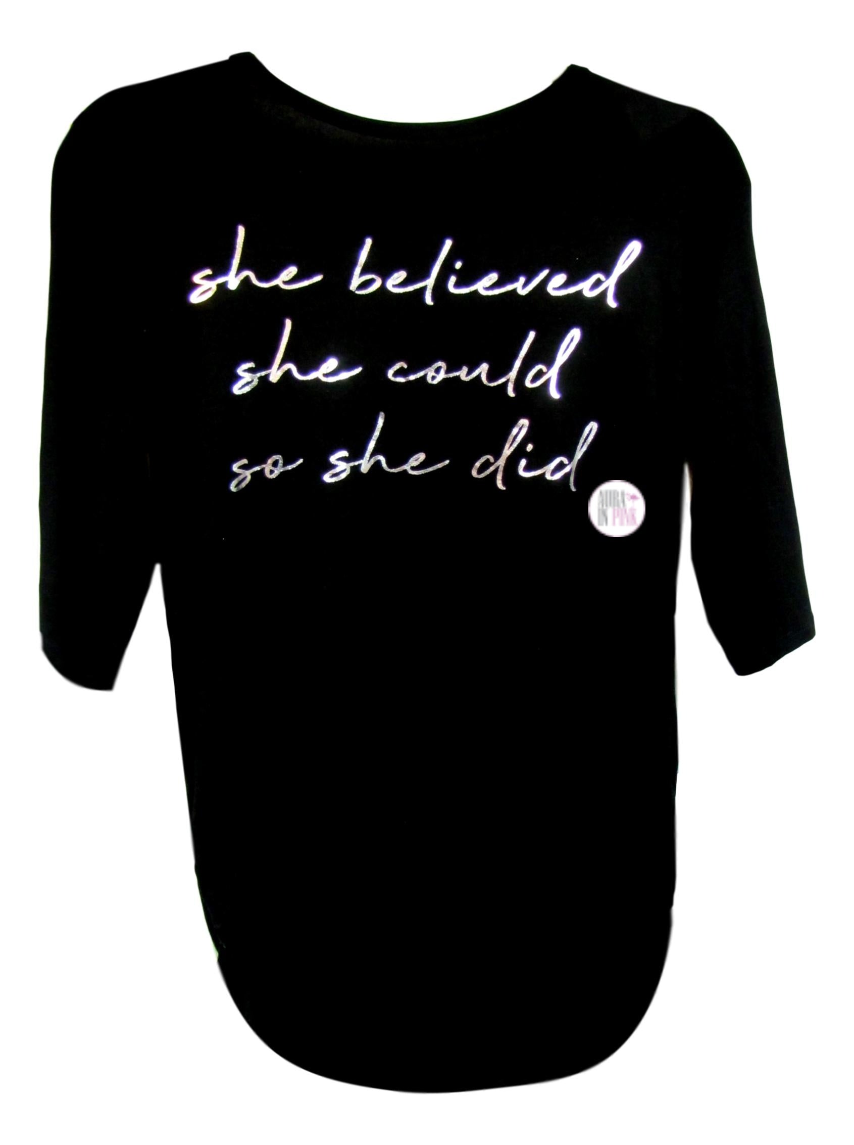 This inspiring She Believed She Could So She Did Silver Script Ladies High Low Top with contrasting metallic silver lettering on black top is fabulous! Wear it with pride or give as a thoughtful gift!