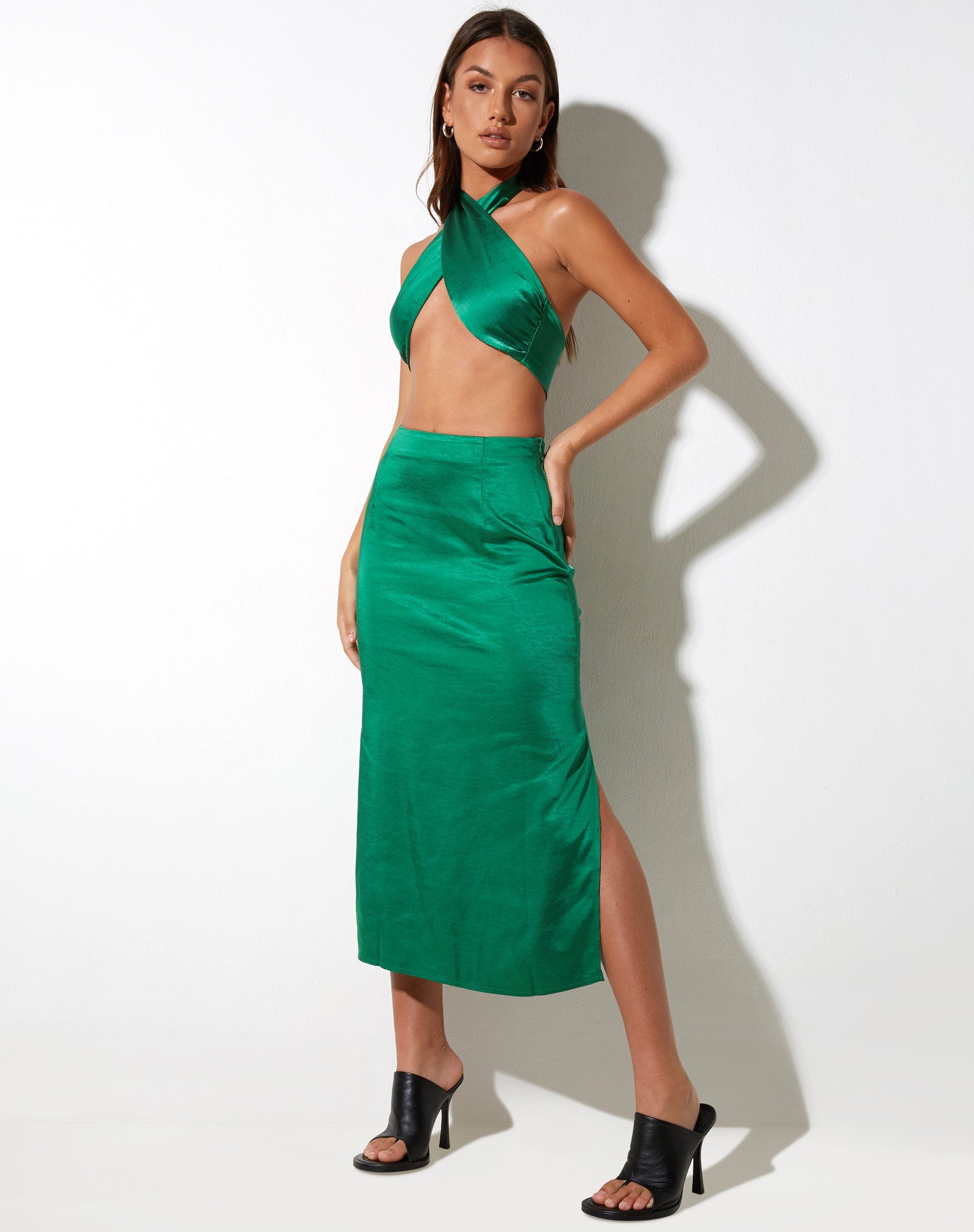 Give your look a luxe vibe with the Tindra skirt. Featuring a midi fit with high waisted design and side split in a green satin finish. For the finishing touch, pair with the Selenda crop top.