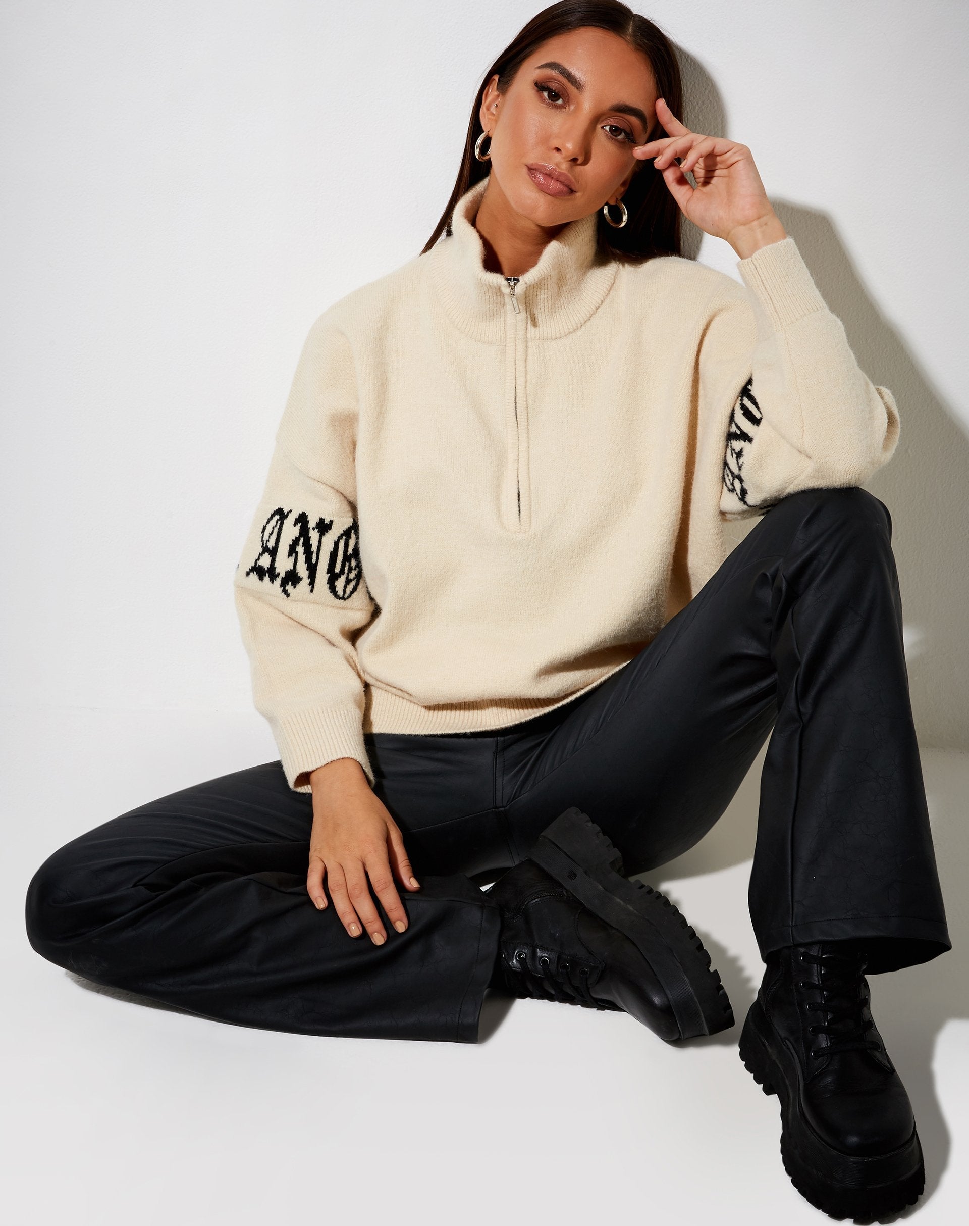 Stay warm this winter in our Tusca sweatshirt. Featuring a loose fit, high neck, long sleeves and zip up front in stone with “Angel” on the sleeves. Finish off your look with our Zoven trousers in PU black and docs.