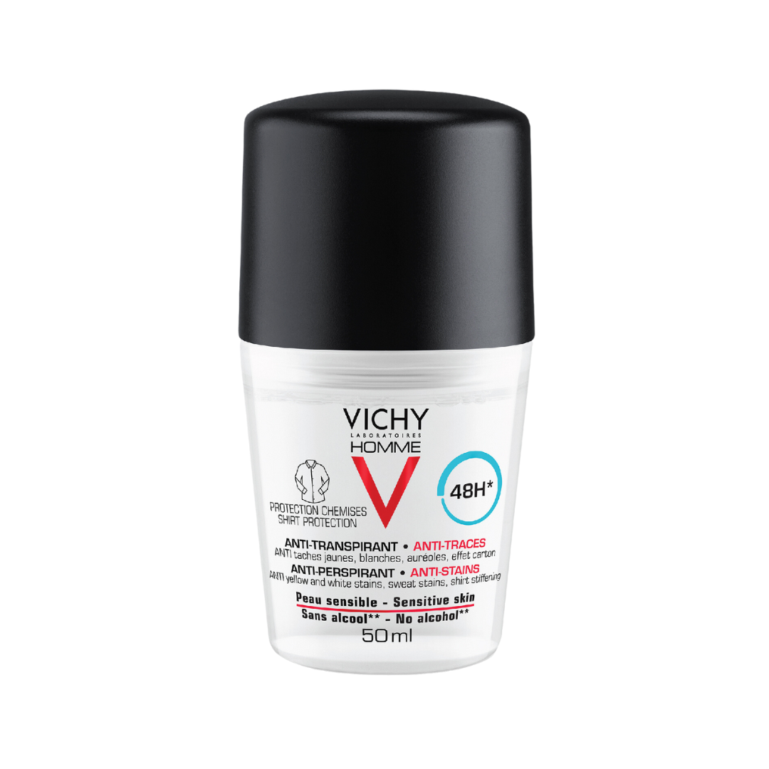 Vichy Homme 48 Hour Anti-Perspirant/Stain Deodorant for Men with sensitive skin. Hypoallergenic. Transparent formula "shirt protection" technology anti-yellow stains, anti-white stains, anti-stiffing, anti-sweat rings. Regulates perspiration for 48h and soothes the skin from discomforts