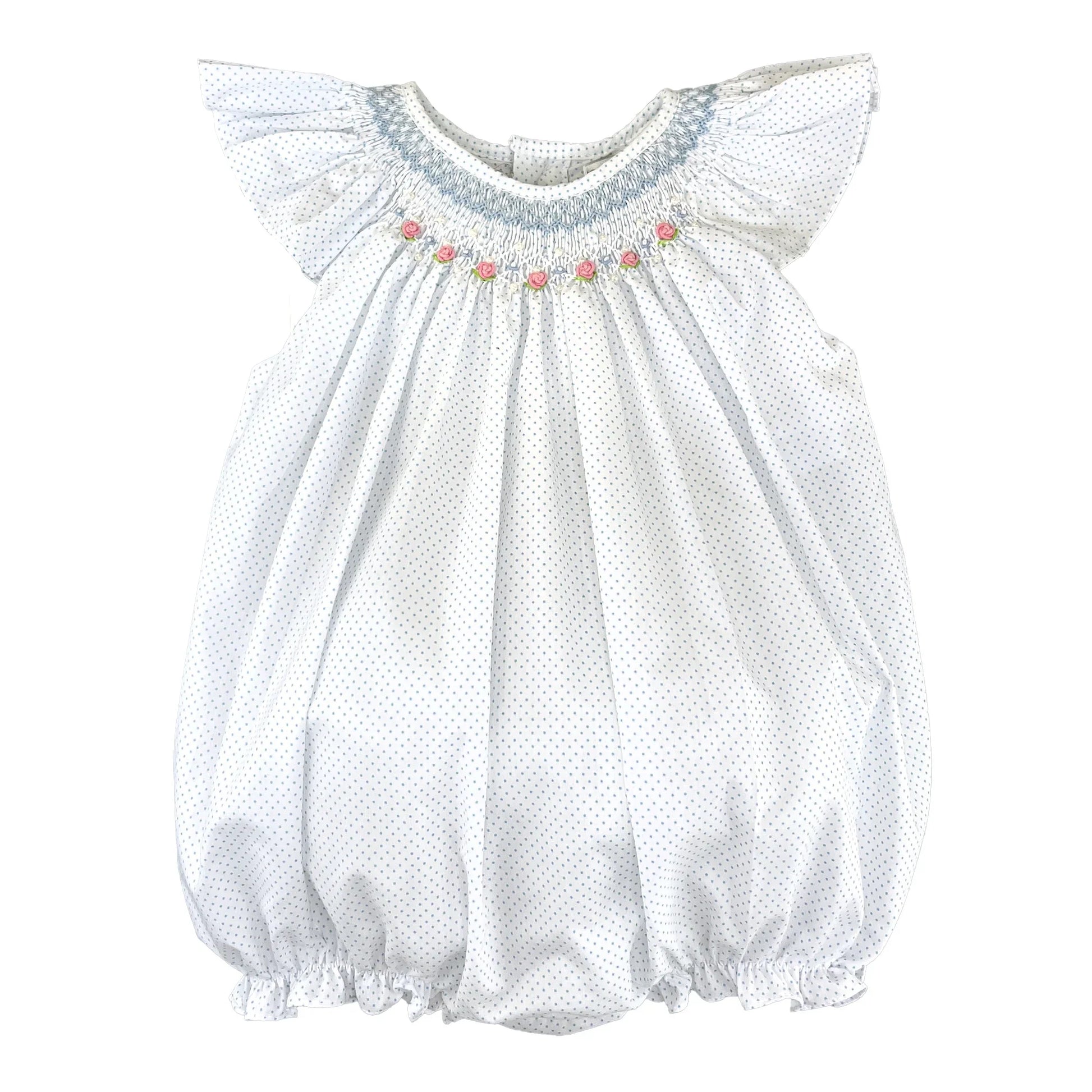 Elevate your little one's style with our White and Blue Dot Smocked Bubble. The delicate angel sleeves and detailed smocking with pearls and flower embroidery add a touch of elegance to this adorable outfit. With convenient back buttons and snaps at the legs, dressing your baby has never been easier.