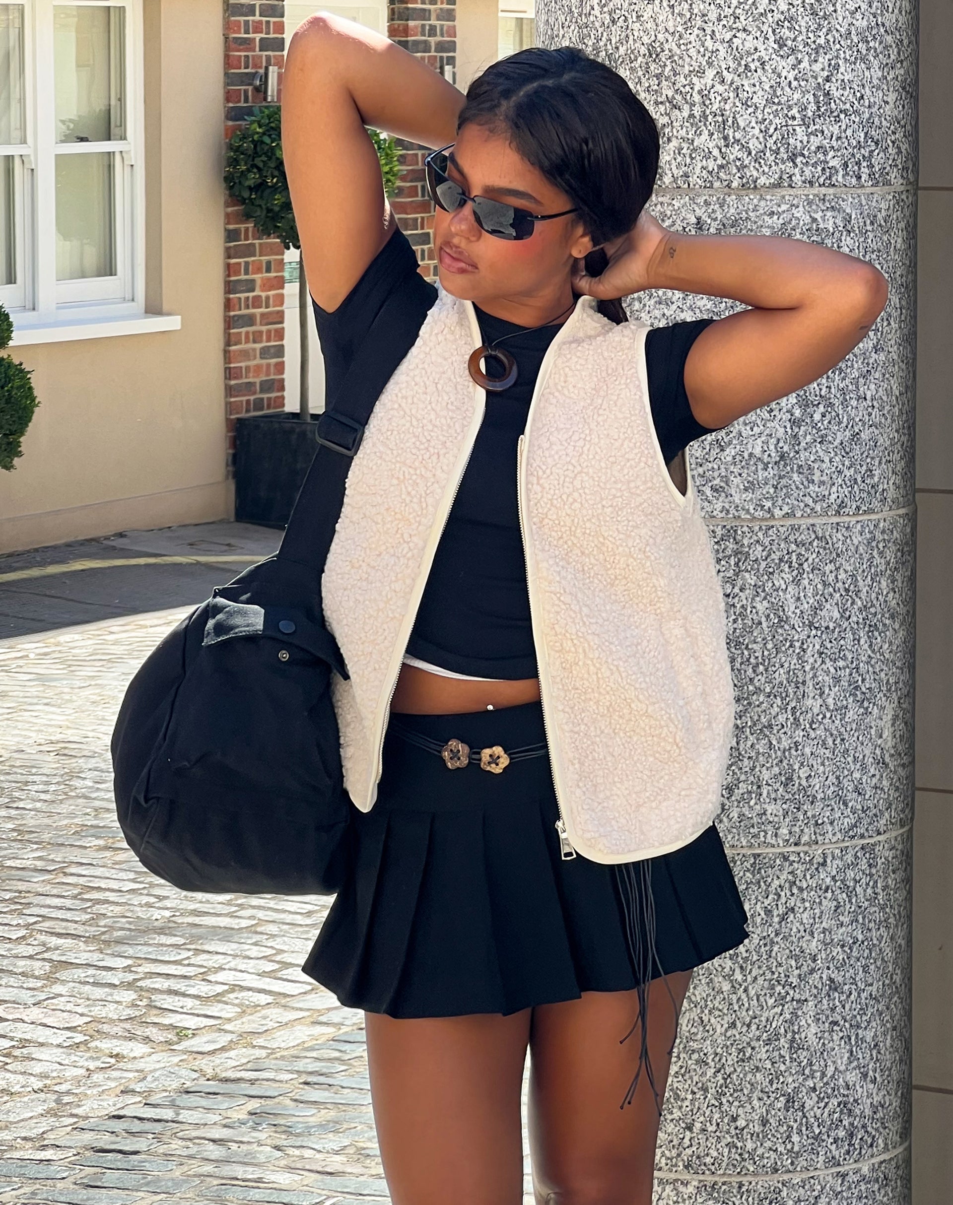 Xiel is the on-trend jacket you need. This borg fleece vest features a V-neck, sleeveless design and zip front. We love to style with the Casini mini skirt.