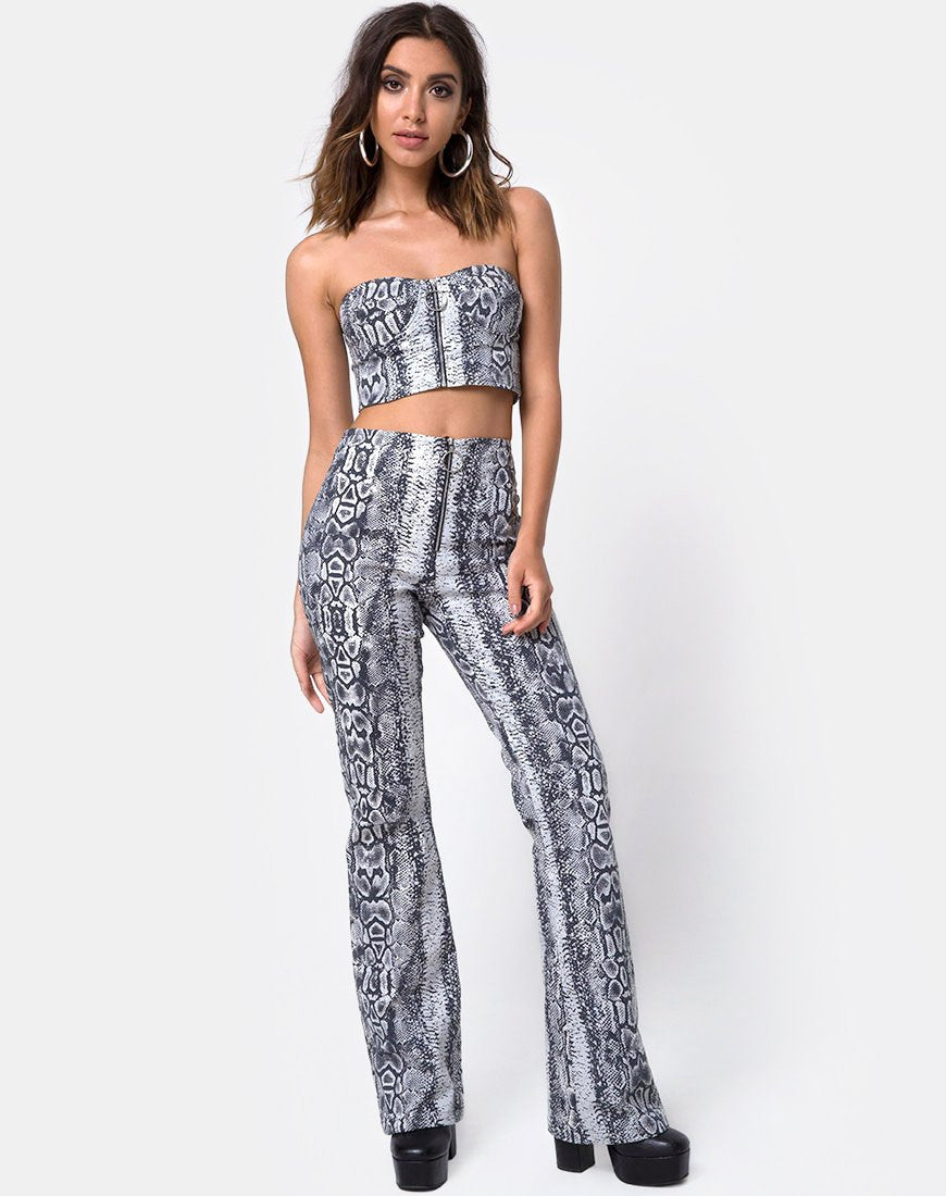 Both edgy and smoking hot, snake print is back and in a big way! Our zolia trouser has got you covered for every big event with it's high waist, flared leg and pull zip fastening. Complete the look with the Zipshi crop for head-to-toe woah!